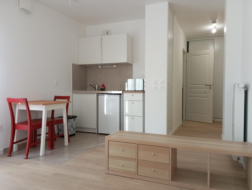 Beau studio neuf de 25,30M². Studio meublé comprenant une entrée avec un grand placard, salle d’eau avec douche et wc, coin cuisine ouverte (aménagée et équipée d’une plaque de cuisson, réfrigérateur et rangements) sur belle pièce avec deux grandes fenêtres. Chauffage et eau chaude collectifs